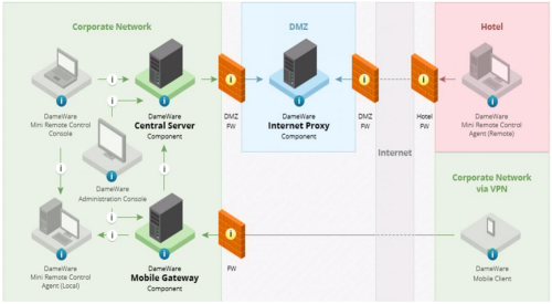- Im DameWare Server ist auch der Internet-Proxy untergebracht, welcher die Verbindungen zwischen LAN und WAN-Remote-Sessions regelt, keine öffentlichen IPs mehr benötigt und auch hinter Firewalls funktioniert. Der Nutzer von außen lädt sich ein Clientmodul herunter und wird dann über den Server zur entsprechenden Caller Maschine verbunden.