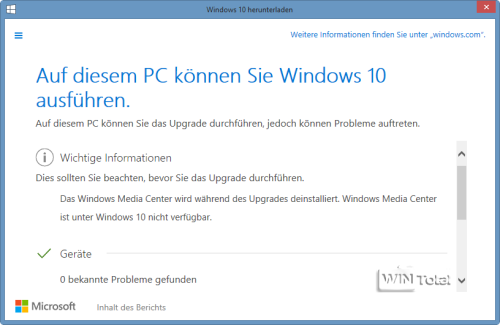 Öffnen Sie das Hamburger-Menü, können Sie Ihren PC überprüfen lassen. Hier wird z.B. angezeigt, dass das Windows Media Center deinstalliert wird, da es unter Windows 10 Final nicht mehr verfügbar ist, und Programme wie VMware nach der Installation von Windows 10 neu installiert werden müssen.