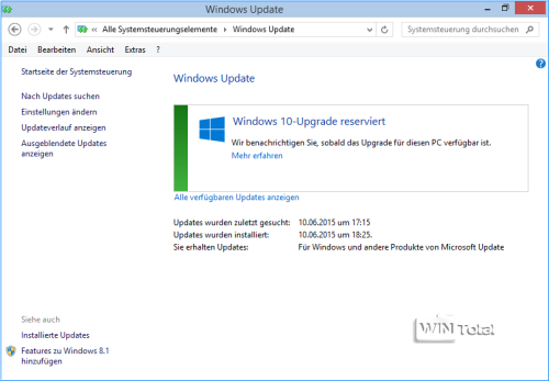 „Windows Update aufrufen“ ruft ganz einfach das Windows Update auf mit dem Hinweis, dass Windows 10 Upgrade reserviert ist.
