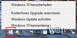 Im Kontextmenü steht „Windows 10 herunterladen“, „Kostenloses Upgrade reservieren“, „Windows Update aufrufen“ und „Windows 10 kennenlernen“.