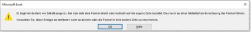 Microsoft Excel erkennt bei der Eingabe einen Zirkelbezug und gibt eine entsprechende Fehlermeldung aus.