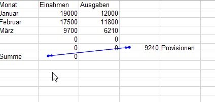 Auf dem Tabellenblatt mit einem Zirkelbezug zeigt Excel mit blauen Pfeilen den Zirkelbezug erkennbar an. Über die Pfeile können Sie so sehr schön erkennen, welcher Zellenbezug für den Zirkel ursächlich ist. In unserem Beispiel wird die Provision zur Summe der Einnahme berechnet, obwohl sich dieser Wert erst aus der Summe ergibt.