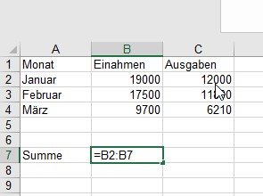In unserem Beispiel soll in der Zelle B7 die Summe von B1 bis B7 berechnet werden. Damit wäre die Zelle B7 Teil der Summe selbst, ein Zirkelbezug.