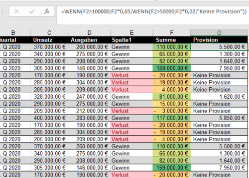 =WENN(F2>100000;F2*0,05;WENN(F2>50000;F2*0,02;"Keine Provision"))