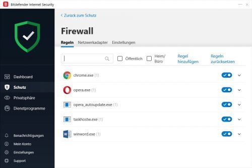 Bitdefender Internet Security 2019 ist mit einer eigenen Firewall ausgestattet, die einen zusätzlichen Schutz vor Malware bietet, indem Sie potentiell gefährliche Anwendungen für den Internetzugriff blockiert oder deren Start unterbindet. Ist ein Programm hingegen vertrauenswürdig, werden die notwendigen Berechtigungen automatisch im Hintergrund vergeben. Sie haben aber natürlich auch jederzeit die Möglichkeit, selbst Regeln und Ausnahmen für ausgewählte Anwendungen zu erstellen.