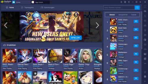 In BlueStacks können mehrere Apps gleichzeitig mithilfe der Registerkarten gestartet und für diese sogar unterschiedliche Google-Konten verwendet werden. Dank des integrierten App Centers lassen sich kompatible Apps und Spiele schneller finden. In der Informationsleiste auf der rechten Seite präsentiert Ihnen der Player die interessantesten Apps verschiedener Genres (darunter beispielsweise Rollenspiele, Strategie, Rennsimulationen oder Action) sortiert in den Kategorien „Beliebt“, “Verkaufshits“ und „Trends“. Durch Anklicken der Vorschau werden Sie direkt zur betreffenden Seite jeweiligen Store verzweigt. Dort können Sie diese entweder installieren oder innerhalb des Stores weiter nach Apps oder Spielen suchen.