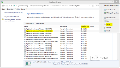 Klicken Sie dazu im Windows-Update-Fenster ganz unten links auf „Installierte Updates“. Ändern Sie die Ansicht auf „Details“ und klicken Sie auf „Installiert am“, so dass das aktuelle Datum oben steht. So sollten Sie den Eintrag „Update für Microsoft Windows (KB3035583)“ schneller finden. Mit Rechtsklick auf den Eintrag können Sie das Update deinstallieren.