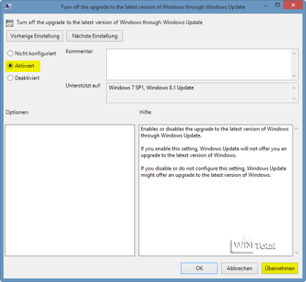 erfolgen. Alternative ist die Aktivierung der Gruppenrichtlinie (nicht bei Home-Editionen) unter „Computerkonfiguration – Administrative Vorlagen – Windows-Komponenten – Windows-Update“ – „Turn off the upgrade to the latest version of Windows through Windows Update„. Diese ist nur vorhanden, wenn die passenden Vorbereitungsupdates vorher eingespielt wurden.