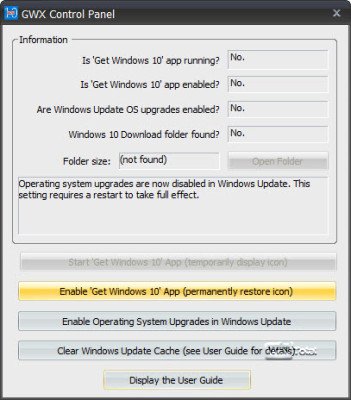 Fühlt sich der Anwender für Windows 10 bereit, kann man mit dem Tool die Einstellungen einfach wieder zurücksetzen (Enable ‚Get Windows 10‘ App)