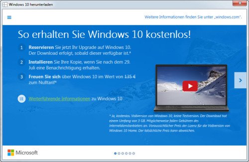 Klickt man auf das Icon, bietet Microsoft eine kostenlose Registrierung für das Upgrade auf Windows 10 an.