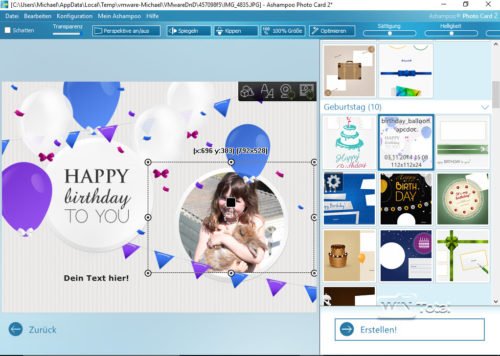 Darüber hinaus existieren spezielle Programme für die Kartengestaltung. Oftmals enthalten sie bereits Vorlagen für die verschiedenen Anlässe. Wer Fotos auf seiner Einladungskarte verwenden will, sollte die kostenlose Vollversion von Ashampoo Photo Card testen, welche z.B. bei ComputerBild kostenlos heruntergeladen werden kann.