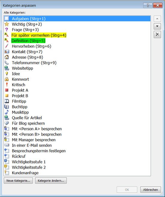 Highlight des Programms sind die Kategorien. Damit kann man jedem Absatz eine zusätzliche Eigenschaft zuordnen, nach der dann das gesamte Notizbuch durchsucht werden kann. Kategorien funktionieren wie Ein- und Ausschalter: Kontrollkästchen beispielsweise werden bei Klicken zugeordnet, angehakt oder wieder entfernt. Ein Klick in ein bereits vorhandenes Kästchen setzt ein Häkchen oder entfernt es wieder. Intern heißen die Kategorien auch Tags – man kann eigene Kategorien erstellen, sie suchen lassen und damit Zusammenfassungsseiten erstellen.