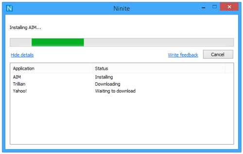 Von der Installation der Programme selbst bekommt man, sobald der Installer gestartet ist, nicht viel mit. Diese läuft im Hintergrund ab und Ninite unterdrückt alle Abfragen, die man bei der manuellen Installation sonst erhalten würde, und beantwortet diese im besten Interesse des Nutzers. Nur ein Statusfenster hält den Nutzer über den Fortschritt auf dem Laufenden. Da Ninite gleichzeitig herunterlädt und installiert, könnte die Installation praktisch nicht schneller sein (siehe Screenshot).