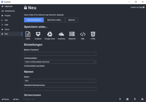 Trotzdem lässt KeeWeb keine wichtige Funktion vermissen, kann beispielsweise direkt auf verschiedene Cloud-Speicher für die Synchronisation zugreifen, unterstützt das KDBX-Format von KeePass und kann dessen Dateien direkt öffnen. Das ist auch gut so, da KeeWeb keine sonstigen Import- oder Exportmöglichkeiten kennt und auch selbst keine mobilen Apps bietet. Alle Apps für das KDBX-Format können aber die KeeWeb-Datei auch auf Android oder iOS laden.