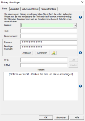 Weitere Felder können optional ausgefüllt werden. Manche Passwort-Manager wie beispielsweise KeeWeb bieten auch die Möglichkeit, verschiedene Vorlagen zu erstellen, welche dann je nach Kategorie auch andere Felder abfragen können.