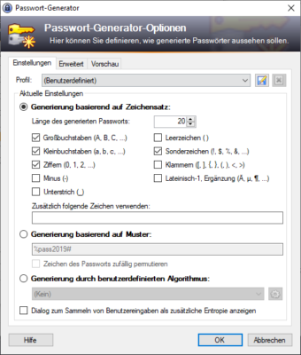 Für neue Einträge legt KeePass direkt komplexe Kennwörter an, welche den Vorgaben des Passwort-Generators entsprechen. Dieser kann auch manuell gestartet werden und bietet eine Fülle von Möglichkeiten für komplexe Kennwörter.