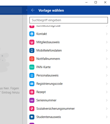 Dass man in einem Passwort-Manager auch andere Dinge speichern kann, demonstriert Enpass sehr schön. Wenn Sie einen neuen Eintrag anlegen, gibt es auch den Abschnitt „Verschiedenes“. Dort finden Sie Vorlagen für Adressen, Bibliotheksausweis, Konfektionsgröße, Fahrzeugdaten, Personalausweis, Notfallnummern und vieles mehr.