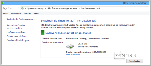 Seit Windows 8 bietet Microsoft eine weitere Backuplösung, den Dateiversionsverlauf, welcher quasi als Nonstop-Backup fungiert. Der Dateiversionsverlauf sichert automatisch im Hintergrund Windows-Bibliotheken, Favoriten, Kontakte und den Desktop auf eine externe Festplatte oder einen Netzwerkspeicher – und zwar in regelmäßigen Abständen, wenn Veränderungen vorgenommen wurden. Das Ganze funktioniert aber nur, solange der Backupdatenträger angeschlossen ist – und damit auch in Reichweite von Trojanern und Viren!