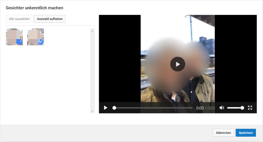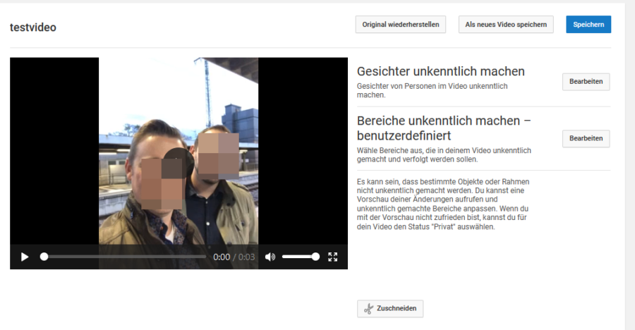 Youtube bietet hier mit der Funktion „Unkenntlich machen“ die Möglichkeit, das Video automatisch zu analysieren und die Gesichter aller Personen unkenntlich zu machen. Sie können aber auch einen Bereich im Video festlegen, welcher unkenntlich gemacht werden soll.