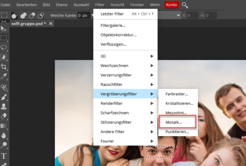 - Wählen Sie nun über die Menüleiste in Filter -> Weichzeichnen -> Verpixeln