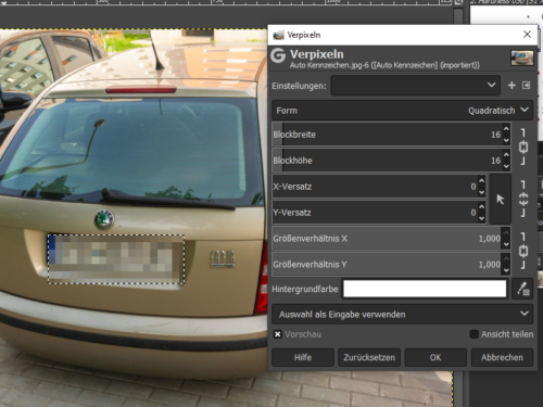 Markieren Sie dazu den Bereich wie Augen, Gesicht oder Kennzeichen mit der gedrückten Maustaste und wählen Sie dann unter Bild -> Effekte -> Einstellungen/Vorschau. In dem folgenden Fenster können Sie dann den Effekt „Pixelize“ auswählen mit dem Schieberegler den Grad der Verpixelung bestimmen. Mit OK wird der Filter übernommen.