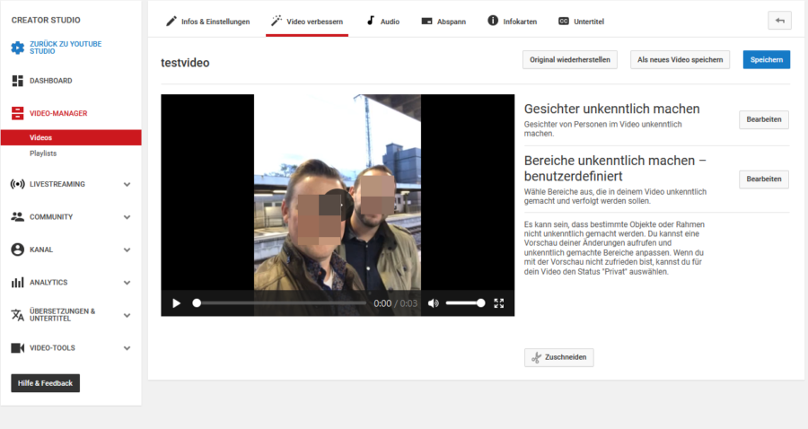 Bei Youtube können Sie nach dem Anmelden und Hochladen im Video-Manager das Video auch bearbeiten. In der Timeline finden Sie den Eintrag „Unkenntlich machen“, welcher Sie zum klassischen Creator Studio umleitet. Wenn Sie direkt im klassischen Creator Studio von YouTube arbeiten, finden Sie die Funktion unter „Video verbessern“.