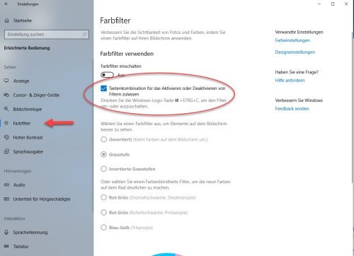 Der Farbfilter kann mit der Windows-Tastenkombination WIN+STRG+C aktiviert werden. Dazu muss aber seit Windows 10 Version 1803 (April-Update) die Funktion der Tastenkombination erst in den Einstellungen unter Erleichterte Bedienung -> Farbfilter unter „Tastenkombination für das Aktivieren oder Deaktivieren von Filtern zulassen“ aktiviert und der Standard-Farbfilter festgelegt werden.