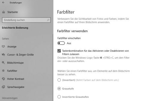 Windows 10 besitzt seit Version 1709 auch Farbfilter für Anwender, welche Objekte und Elemente auf dem Bildschirm nicht richtig erkennen können. Neben Graustufen oder invertierten Farben stehen auch Anzeigemöglichkeiten für Grünsehschwäche (Deuteranopie), Rotsehschwäche (Protanopie) oder Blaublindheit (Trotanopie) zu Verfügung.