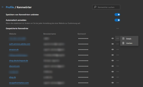 Der Browser Microsoft Edge in Windows 10 und Edge Chromium speichern auch Kennwörter im Profil des Anwenders. Sie können hier gespeicherte Kennwörter löschen, indem Sie in die Browsereinstellungen wechseln. Im Eintrag „Profile“ finden Sie die Unteroption „Kennwörter“.