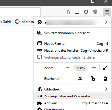 Um in Firefox auf dem Desktop ein Passwort zu löschen, müssen Sie auf das Hamburger-Menü ganz rechts in der Programmleiste klicken und hier den Eintrag „Zugangsdaten und Passwörter“ auswählen.