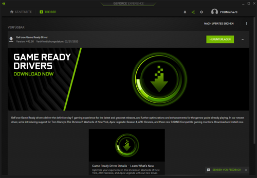 Über GeForce Experience können Sie dann durch Klicken auf den Hinweis zum neuen Treiber das neue Treiberpaket herunterladen und installieren.