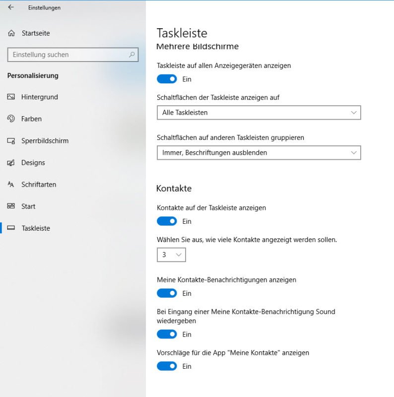 Seit dem Spring Creators Update auf Version 1803 kann die Anzahl der Kontakte auch über Einstellungen -> Personalisierung – > Taskleiste festgelegt werden.