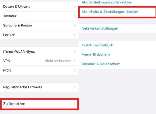 - Tippen Sie auf „Zurücksetzen“ und anschließend auf „Alle Inhalte und Einstellungen löschen“.