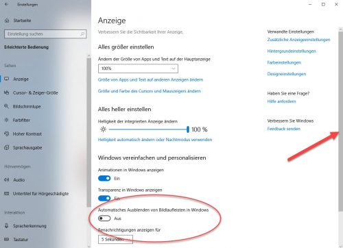 Dazu navigieren Sie in den Abschnitt „Erleichterte Bedienung“ und hier unter „Anzeige“. Der Punkt „Automatisches Ausblenden von Bildlaufleisten in Windows“ kann deaktiviert werden. Im Ergebnis sehen Sie dann sofort die Bildlaufleisten in den Einstellungen und anderen Apps von Windows 10.