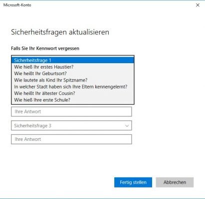 Windows 10 bietet in neueren Versionen die Möglichkeit, zu dem Benutzer-Kennwort auch Sicherheitsfragen und passende Antworten zu hinterlegen für den Fall, dass einem das Kennwort entfällt.