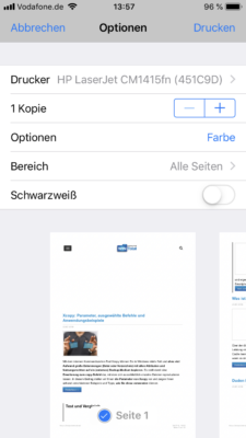 Sie haben dann die Auswahl, auf welchem AirPrint-Drucker Sie ausdrucken möchten und können noch die Anzahl der Kopien und – sofern es sich um einen Farbdrucker handelt – auch noch Farbe oder Schwarz-weiß-Druck aktivieren.