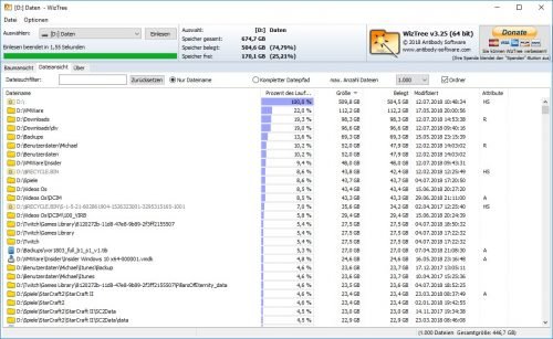 Glücklicherweise gibt es im Internet einige praktische Cleaner-Tools, mit denen Sie Speicherfresser identifizieren und entfernen können. Das kleine Programm „WizTree“ sortiert beispielsweise Ordner und Dateien nach Größe und Anzahl und listet die größten Inhalte in einem „Top 1000“- Ranking auf. So können die Übeltäter ganz leicht ausfindig gemacht und im Anschluss händisch gelöscht werden.
