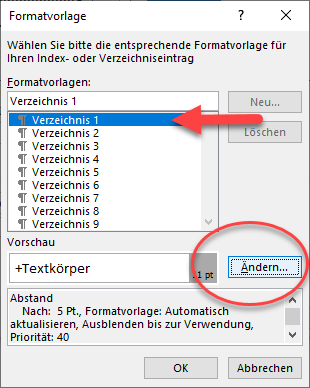 In dem folgenden Fenster müssen Sie nun die Vorlage des Textkörpers für das Verzeichnis 1 anpassen.