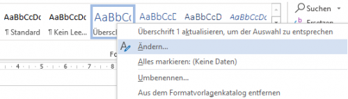 Wie alle Formatvorlagen können auch Überschriften formatiert werden. Klicken Sie dazu im Menüband mit der rechten Maustaste auf eine Formatvorlage. In unserem Beispiel ändern wir die Formatvorlage Überschrift 1 (H1).