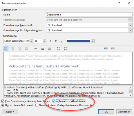 Sie können in dem Dialog „Formatvorlage ändern“ das Aussehen einer Überschrift frei gestalten und die Formatierung wie Schriftart, Größe, Farbe, Ausrichtung, Absatzabstände und vieles mehr anpassen. Mit dem Haken bei „Automatisch aktualisieren“ werden alle verwendeten „Überschriften 1“ im Dokument automatisch angepasst.
