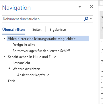 Wenn Sie sich ergänzend den Navigationsbereich über „Ansicht“ einblenden lassen, können Sie die Struktur und Gliederung eines Dokuments bereits sehr gut erkennen.