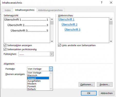 Für ein eigenes Layout vom Inhaltsverzeichnis, beispielsweise mit anderer Schriftart oder Größe, klicken Sie bei Formate „Von Vorlage“ und dann auf den Button Ändern rechts.