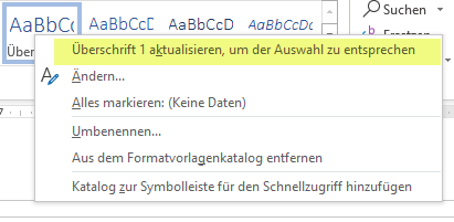 Sobald Sie der ersten Überschrift einen Wert zugewiesen haben, in unserem Beispiel der Überschrift H1 den Wert 1, wechseln Sie mit der rechten Maustaste in das Menüband auf der Überschrift 1 und klicken auf den Eintrag „*Überschrift 1 aktualisieren, um der Auswahl zu entsprechen“. Damit werden alle H1-Überschriften automatisch fortlaufend nummeriert.