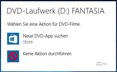 Beim Einlegen einer Film-DVD unter Windows 10 erscheint normalerweise eine Rückfrage, welche Aktion Windows 10 ausführen soll.