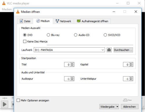 Zur Wiedergabe wählen Sie einfach „Medium öffnen“.