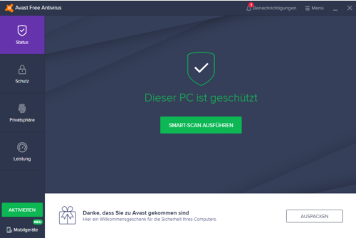 Die Benutzeroberfläche ist aufgeräumt, blendet unten dauerhaft ein „Willkommensgeschenk“ ein, bei dem es sich um ein Rabatt auf Avast Premium Security handelt. Wer den nicht annimmt, muss dauerhaft mit der Einblendung leben.