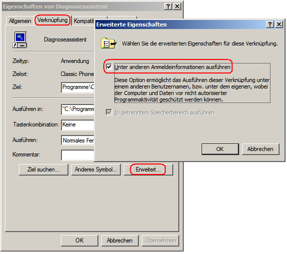 Sie melden sich als Administrator an, öffnen im Startmenü die Eigenschaften der Verknüpfung dieser Anwendung und klicken in der Registerkarte „Verknüpfung“ auf die Schaltfläche „Erweitert…“. Im sich öffnenden Fenster wählen Sie die Option „Unter anderen Anmeldeinformationen ausführen“.