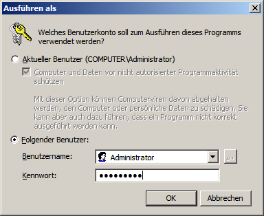 Speziell für Windows XP und Windows 2000 findet man für viele Anwendungen, deren Ausführung unter einer Nicht-Administrator-Kennung Probleme bereiten, unter noadmin.de eine Lösung. Bestimmte Anwendungen laufen jedoch nur mit Administratorrechten, oder es ist zu aufwendig, nach einer Lösung zu suchen und diese im Netzwerk auf vielen Clients umzusetzen. Ist man als einfacher Benutzer angemeldet, so kann man die zugehörige Verknüpfung im Startmenü mit der rechten Maustaste anklicken und den Befehl „Ausführen als…“ wählen, um die Anwendung als Administrator zu starten. Diesen Schritt vergisst man oft – und besonders in Netzwerken, in denen die Domänenbenutzer nur mit einfachen Benutzerrechten arbeiten, ist es umständlich, allen Benutzern zu erklären, bei welchen Anwendungen Sie die Verknüpfung zuerst mit der rechten Maustaste anklicken und den Befehl „Ausführen als…“ wählen müssen, um die Anwendung fehlerfrei mit erweiterten Rechten zu starten. Sie können aber erreichen, dass beim Anklicken bestimmter Verknüpfungen sich automatisch zuerst das Fenster „Ausführen als“ öffnet: