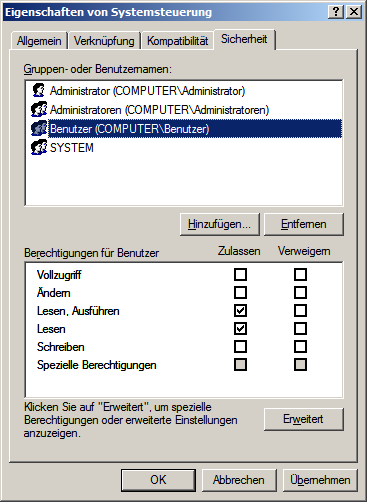 Es gibt jedoch folgende Möglichkeit, um einzelne Komponenten der Systemsteuerung mit Administratorrechten zu starten. Dazu legt man eine neue Verknüpfung an und gibt die zugehörige CPL-Datei an, z.B. %windir%\system32\sysdm.cpl, um die Komponente System zu starten. Sobald die Verknüpfung erstellt ist, öffnet man deren Eigenschaften und wählt in der Registerkarte „Verknüpfung“ über die Schaltfläche „anderes Symbol…“ zuerst ein einprägsames Symbol für die Verknüpfung aus. Über die Schaltfläche „Erweitert…“ aktiviert man die Option „Unter anderen Anmeldeinformationen ausführen“. Wichtig ist außerdem, dass man in der Registerkarte „Sicherheit“ die Sicherheitsgruppe „Benutzer“ oder aber zumindest die Benutzerkennung desjenigen Benutzers hinzufügt, der später die Änderungen in der Systemsteuerung vornehmen darf.