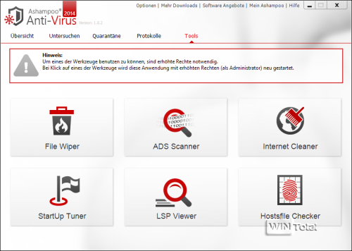 Ashampoo Anti-Virus hat zudem noch eine Reihe weiterer Sicherheitstools wie den File Wiper, ADS Scanner, Internet Cleaner, StartUp Tuner, LSP Viewer und Hostsfile Checker.